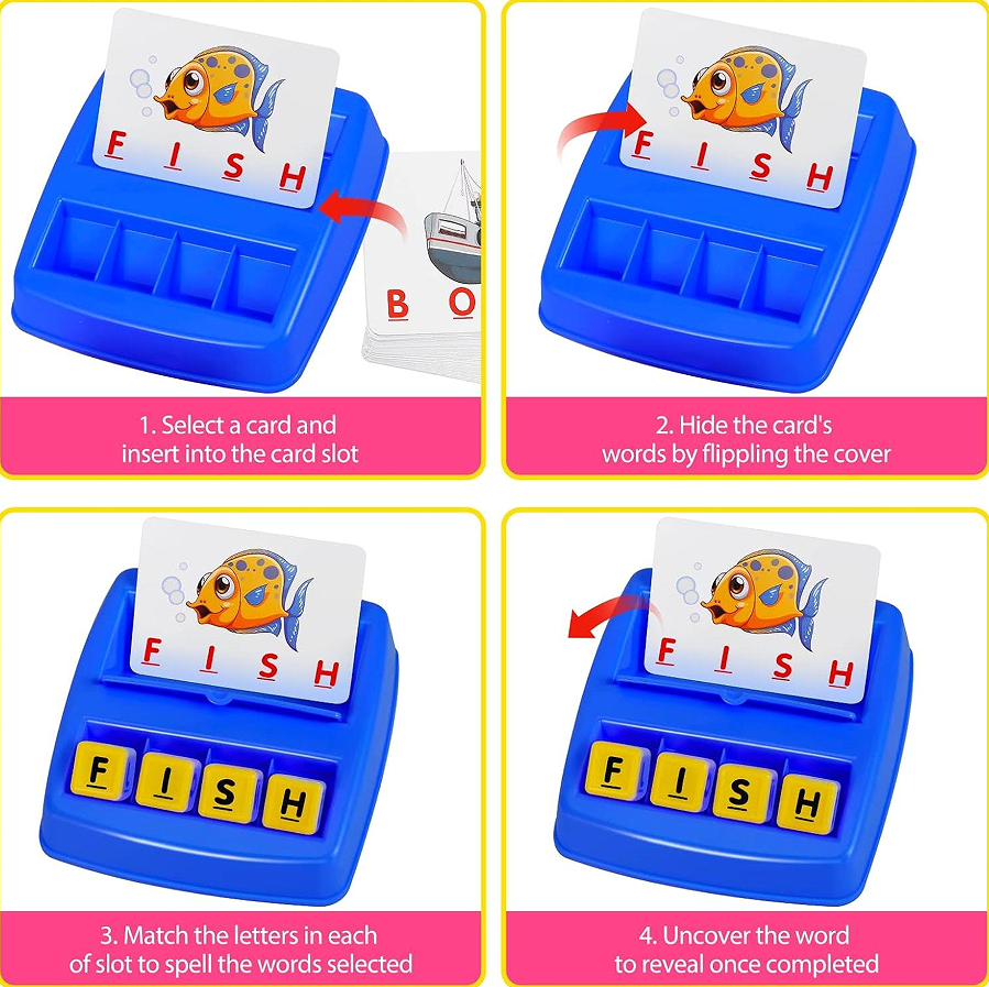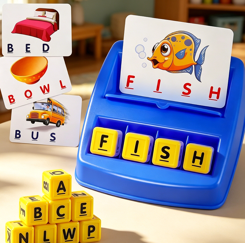 This game includes a plastic tray, 30 double-sided picture cards, and 80 wooden letter tiles. The child places a card in the tray and matches letter tiles to the word shown. The intended age is three to eight years, with simpler three-letter words for younger children and four-to-five-letter words for older ones. The tray is made from ABS, and the tiles are beech wood. The game promotes letter recognition, spelling, and visual memory. No batteries or screens are required. This product does not guarantee reading fluency. It is suitable for two or more players or solo play.