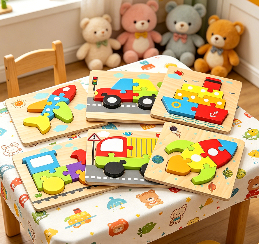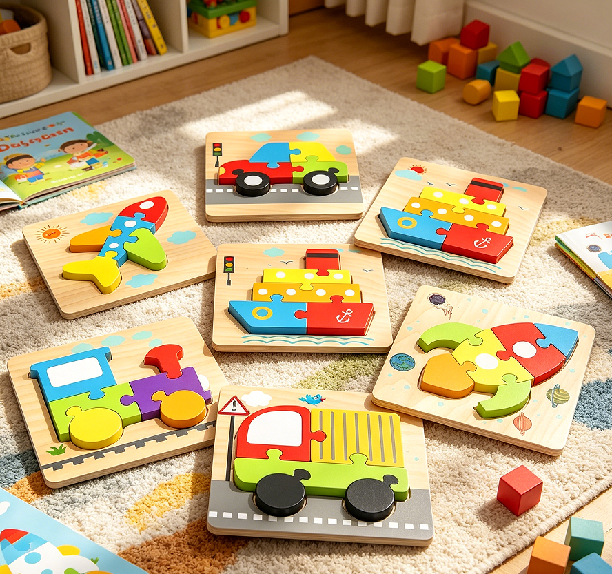 This set includes six wooden vehicles (car, train, boat, aeroplane, truck, and helicopter) that can be taken apart and reassembled like simple block puzzles. Each vehicle consists of two to four pieces that connect via pegs and holes. The material is solid wood with coloured stains rather than surface paint, reducing the risk of chipping. The intended age range is one to three years, but children up to four years may also enjoy the assembly challenge. The toys help with understanding cause and effect, symmetry, and basic engineering concepts. No instructions are needed, as the pieces are self-correcting. The set comes in a wooden storage tray. This product does not claim to teach vehicle mechanics or reading skills. It is offered as a gift option for toddlers.