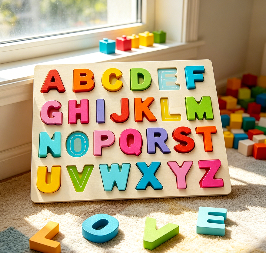 This puzzle presents the alphabet in uppercase letters, with each letter sitting in its own well. The wooden board is approximately 30 cm by 22 cm, and the letters are 3 cm tall. The material is rubber wood, and the paint is water-based. The product is intended for children aged three years and above. The primary use is to familiarise toddlers with the shapes and names of letters. The puzzle can be used for matching games, spelling simple words, or colour sorting, as each letter is painted in a different colour. The set includes a cotton drawstring bag for piece storage. This is a standalone product and does not include numbers or shapes. No warranties are expressed or implied regarding learning speed. The puzzle complies with general safety standards for children’s toys in New Zealand.