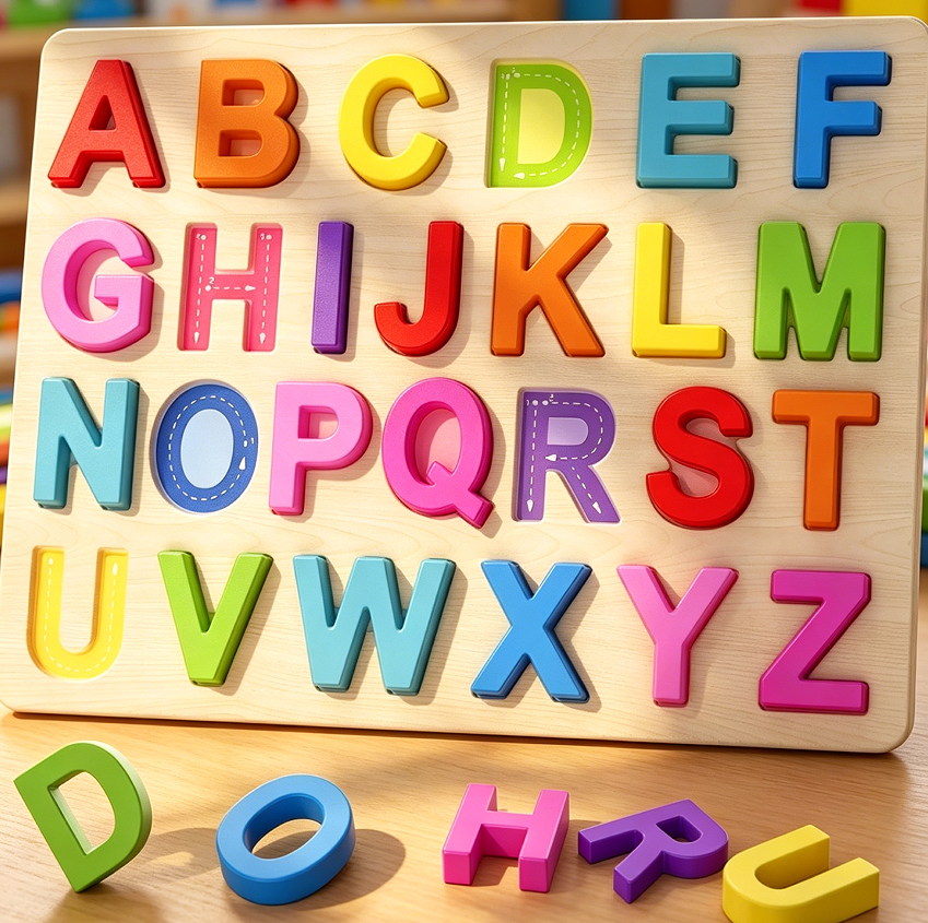 This is a second variation of the alphabet puzzle, featuring lowercase letters instead of uppercase. The board is made of poplar wood, and the letters are raised for easy grasping. The intended age is three to five years. The puzzle helps children become familiar with lowercase letter forms, which are essential for reading. The board includes a printed reference image in the corner of each well. This product does not include numbers or other symbols. It is intended for use under adult guidance for phonics activities. The puzzle meets general safety requirements for children’s toys in New Zealand. No claims are made about reading readiness. The product is packaged in a cardboard box with a transparent window.