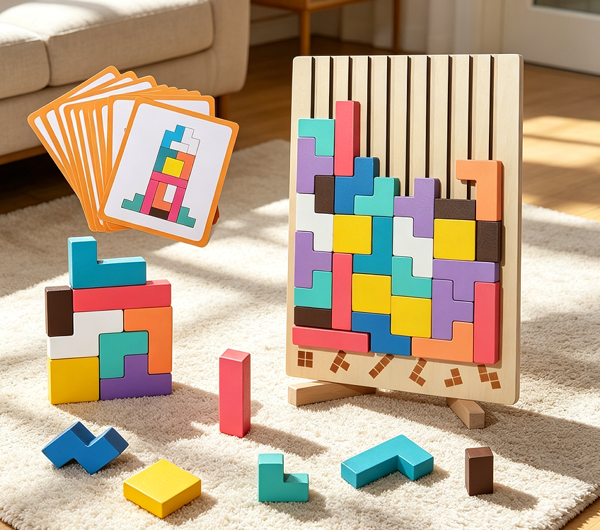 This puzzle consists of 40 wooden blocks in various geometric shapes (triangles, squares, parallelograms, etc.) that can be arranged to form thousands of patterns. A guidebook with 60 designs is included. The blocks are made from basswood and painted in ten colours. The intended age is three to six years. The toy develops spatial reasoning, symmetry, and creative thinking. The blocks can also be used for stacking or colour sorting. No magnets or electronics are used. This product does not claim to improve IQ. It is suitable for solo or group play.